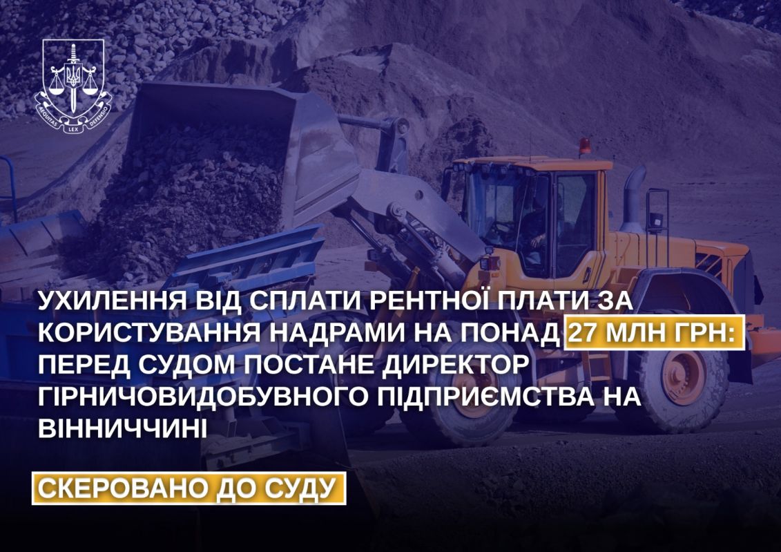 Ухилення від сплати рентної плати за користування надрами на понад 27 млн грн: перед судом постане директор гірничовидобувного підприємства на Вінниччині