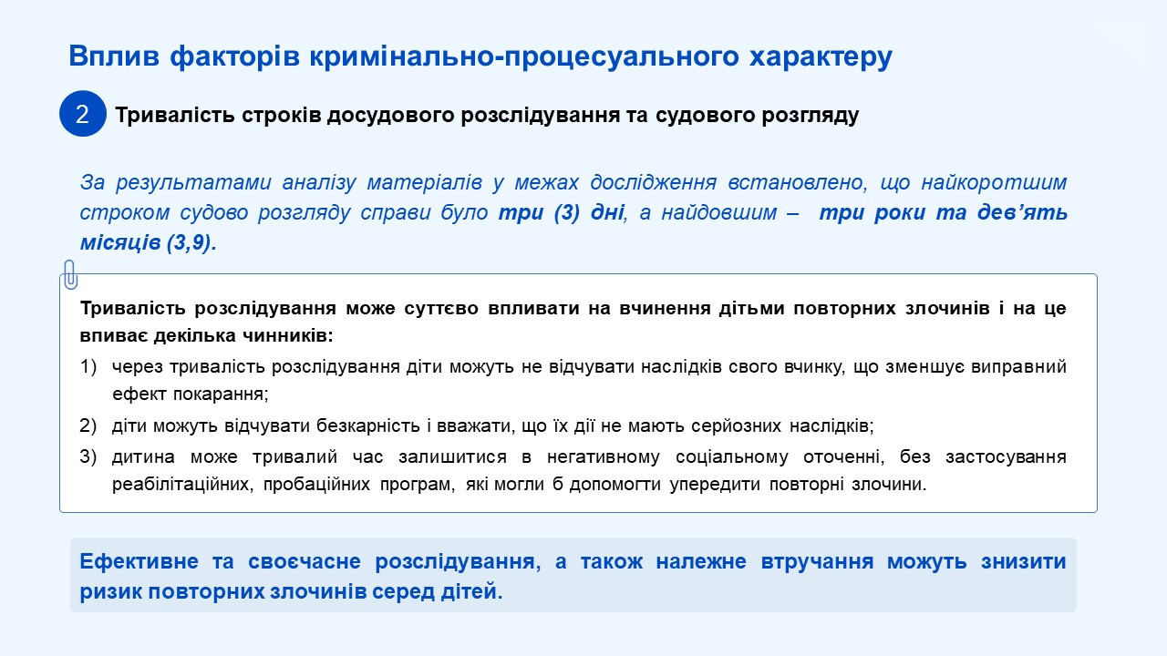 У дослідженні детально розглядаються рівень та структура кримінальних правопорушень, вчинених неповнолітніми, регіональні особливості, характеристики обставин вчинення правопорушень та характеристика осіб самих неповнолітніх, фактори впливу на вчинення злочинів, практики профілактичної роботи з дітьми та надання послуг дітям, які вчинили кримінальні правопорушення.