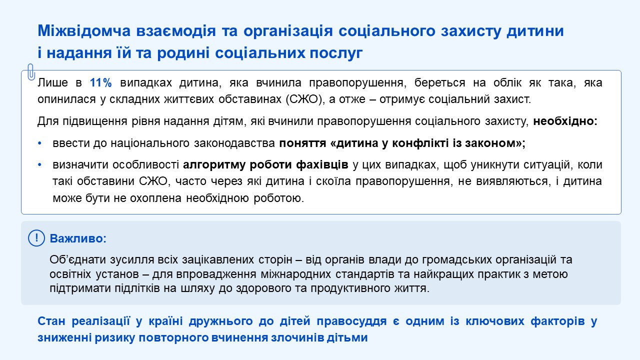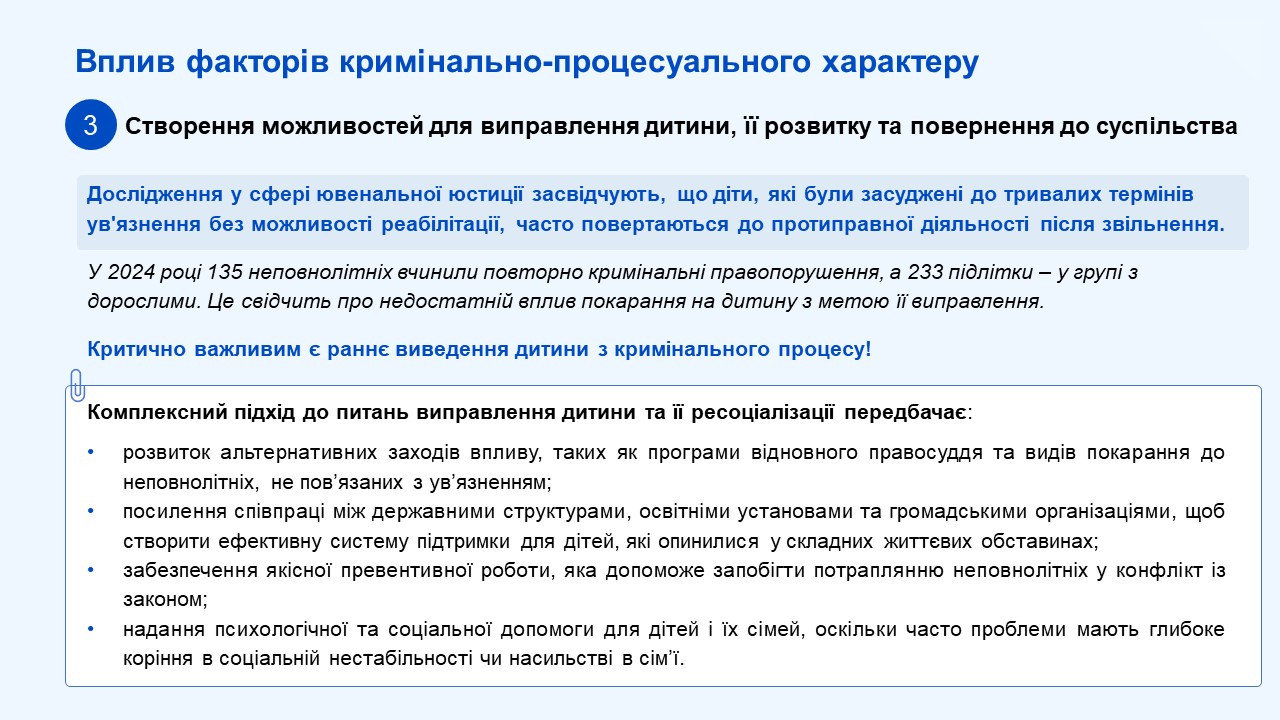 «Війна суттєво вплинула на злочинність серед дітей. Дружнє до дітей правосуддя є одним із ключових факторів у зниженні ризику повторного вчинення злочинів дітьми. Тому зараз дуже важливо адаптувати правосуддя та процедури кримінального провадження до роботи з дітьми з урахуванням їх вразливості та потреб. Крім того, вкрай важливим завданням є розробка та впровадження процедури виведення дитини з кримінального провадження у випадках, коли це дозволяє закон», – підкреслила вона.