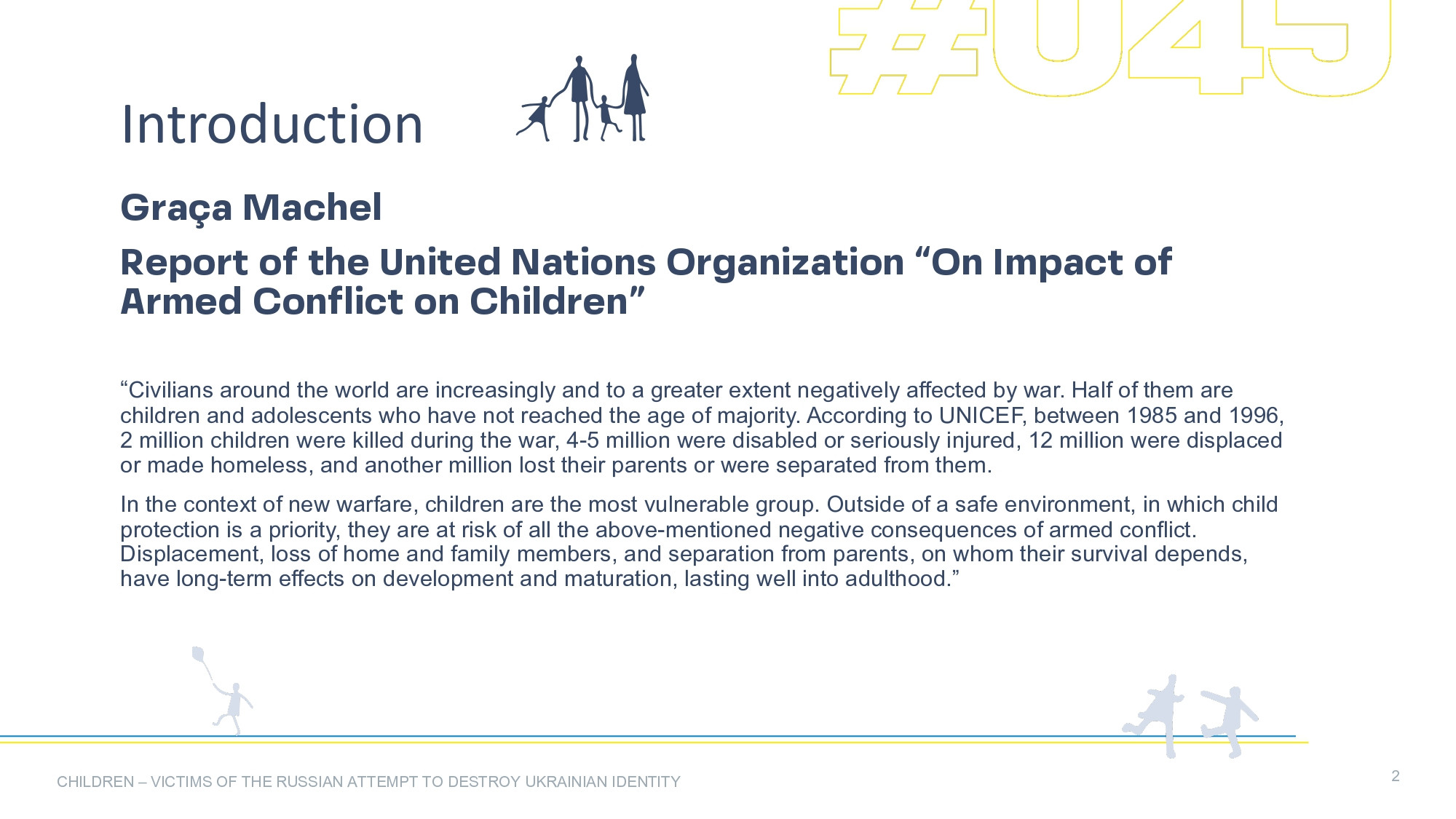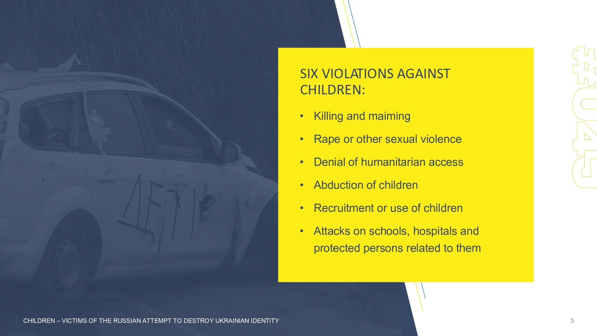 Вона розповіла, що наразі правоохоронці документують шість серйозних порушень норм міжнародного гуманітарного права, які вчиняються проти українських дітей. Це вбивство і каліцтва; зґвалтування та інші форми сексуального насильства; відмова у доступі до гуманітарної допомоги; викрадення; вербування і використання дітей; напади на школи, лікарні, дитячу інфраструктуру.