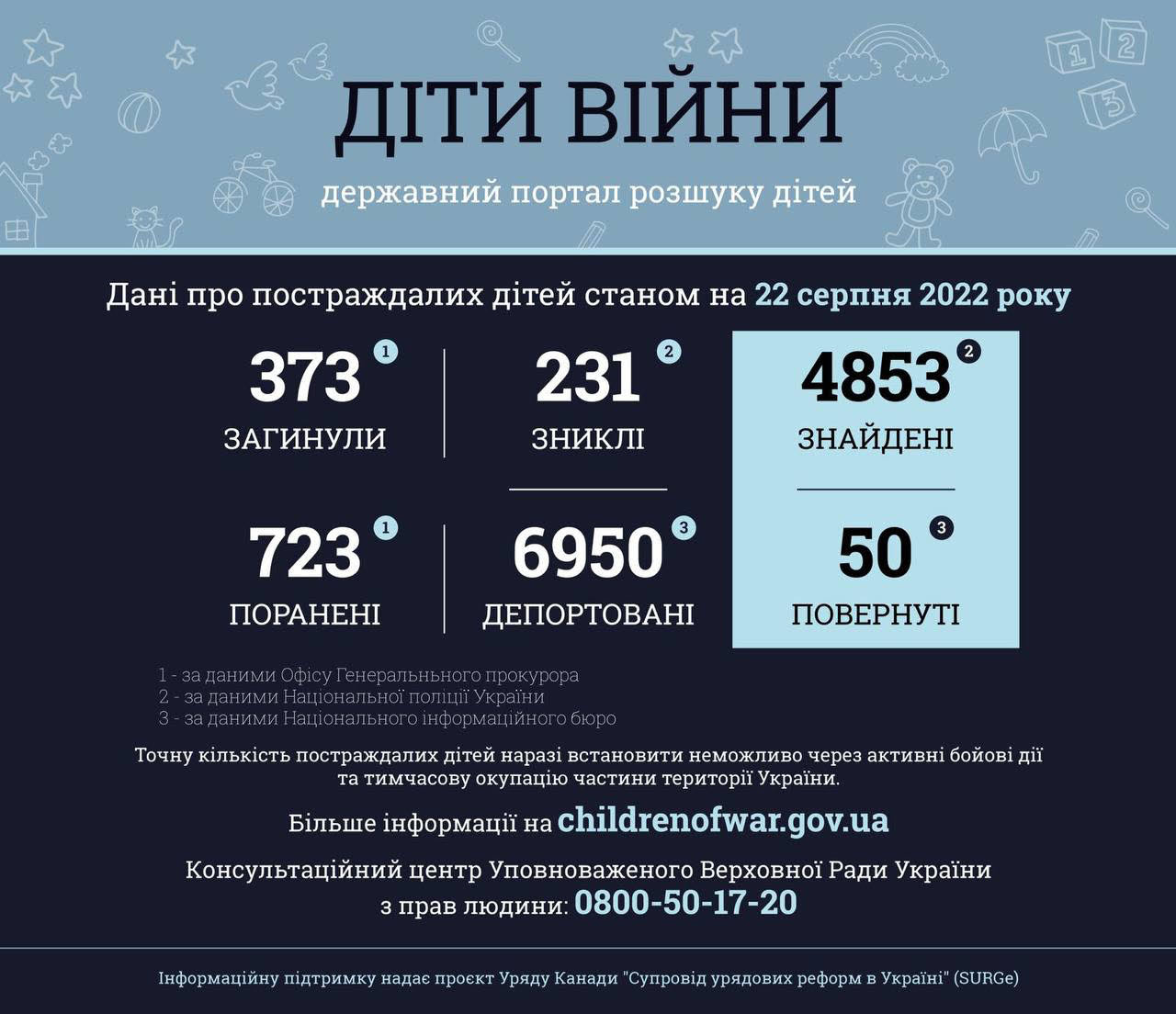 Більше ніж 1096 дітей постраждали в Україні внаслідок повномасштабної збройної агресії Російської Федерації. Станом на ранок 22 серпня 2022 року офіційне число дітей-жертв за добу не змінилося - 373. Зросла кількість поранених - понад 723.