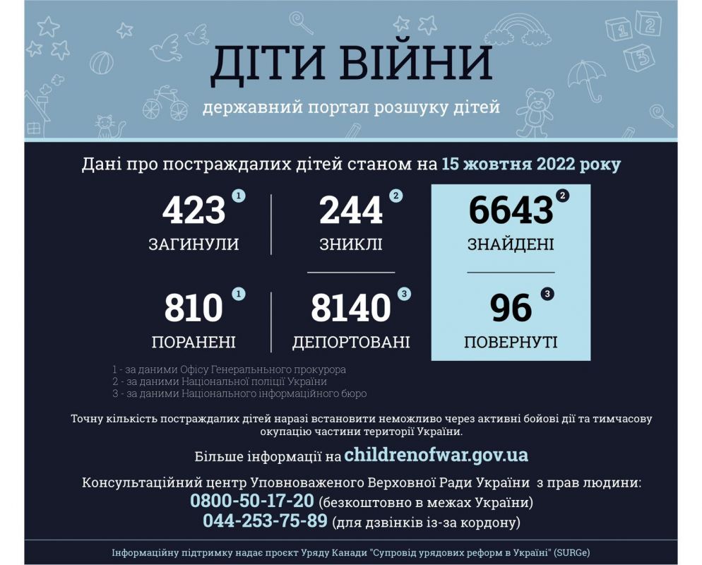 Більше ніж 1233 дитини постраждали в Україні внаслідок повномасштабної збройної агресії Російської Федерації. Станом на ранок 16 жовтня 2022 року офіційне число дітей-жертв за добу не змінилося - 423. Не зазнали змін і дані щодо поранених - 810.