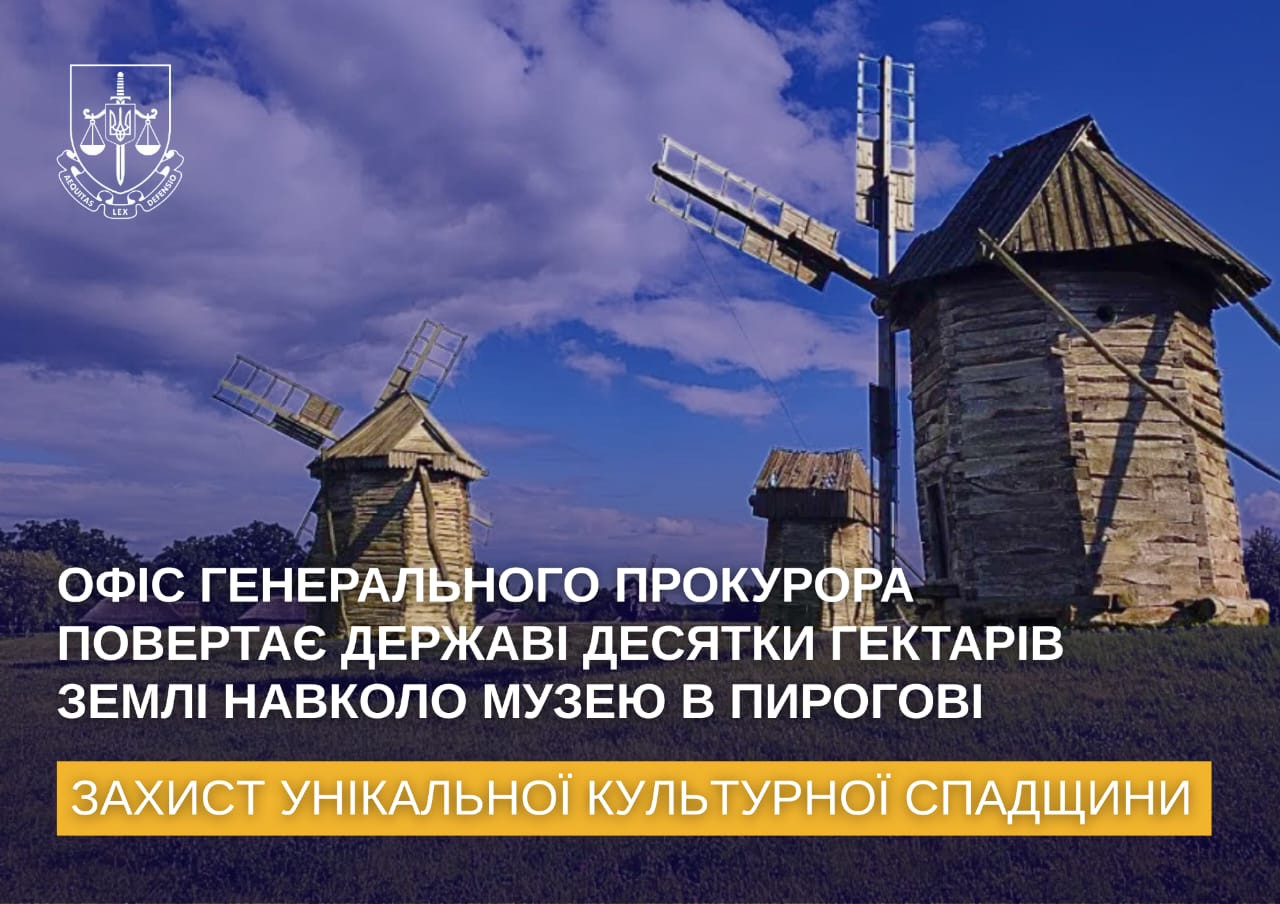 Завдяки системній роботі Офісу Генерального прокурора, який понад десять років здійснює представництво інтересів держави в судах та ініціює скасування незаконних рішень органів місцевої влади, вдалося зупинити комерційне загарбання території довкола Національного музею народної архітектури та побуту України в Пирогові та повернути у власність територіальної громади десятки гектарів землі, включно з тими, що входять до охоронних зон музею.
